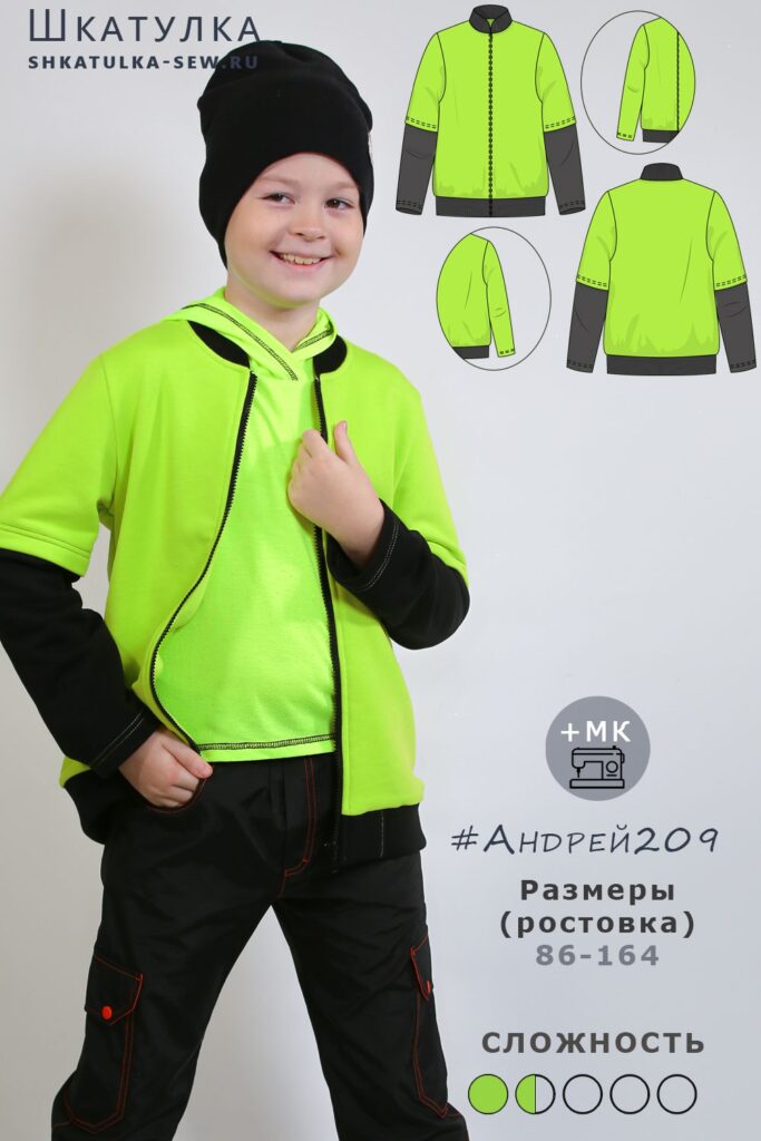 Детская толстовка с застежкой-молнией – это всегда комфортно, стильно и очень практично. А такая вариативная выкройка с комбинированным вариантом рукава позволит сшить легкую эффектную курточку с короткими рукавами, скомбинировать рукав из тканей-компаньонов или же получить классическую куртку-бомбер. Такую куртку легко надеть, снять или же просто расстегнуть в помещении. Использование при пошиве контрастной молнии, пояса, манжет, логотипов или термотрансферов превратят толстовку в яркий эксклюзивный наряд для самого взыскательного модника.