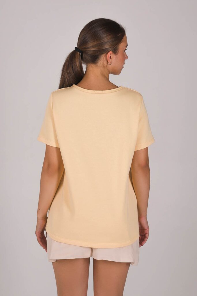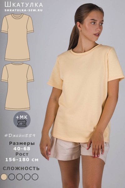 Выкройка футболки увеличенного объема с круглой горловиной, обработанной обтачкой из трикотажа рибана/кашкорсе. Рукав короткий прямой. все размеры в источнике