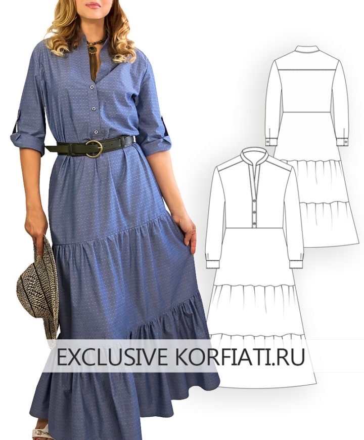 Бесспорным трендом этого сезона является платье-рубашка, причем в самых разнообразных вариантах — от классического прямого изделия миди до расклешенных моделей с длинной широкой юбкой в пол. И даже если в вашем гардеробе уже достаточно платьев, мы уверены, что модель, которую мы хотим вам предложить в нашем очередном уроке, никого не оставит равнодушным. Платье сшито из стильного рубашечного поплина цвета Деним Блу (англ. Denim Blue) внешне похожего на джинсовый материал. Воротник-стойка, двуслойная кокетка и рукава, фиксирующиеся на паты — все это детали знакомой всем нам классической рубашки. Добавим к этому широкую юбку с оборками и получим стильное и одновременно комфортное платье, в которое невозможно не влюбиться! Специально для вас в этом уроке мы публикуем готовую выкройку платья с оборками на 5 размеров, скачать которую наши подписчики могут абсолютно бесплатно.