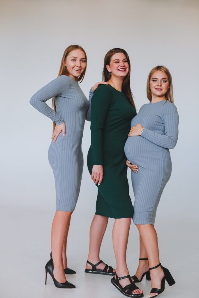 1. Элина. Фигура на момент фотосессии по груди – 46, по бёдрам – 44. Рост 158. Синее платье сшито, без вытачек на спине, с секретом для ГВ и крылышками – 158-42. Серое платье сшито в размере 44, с вытачками на спине. Оба платья сшиты по разметке для беременных. Срок 32 недели