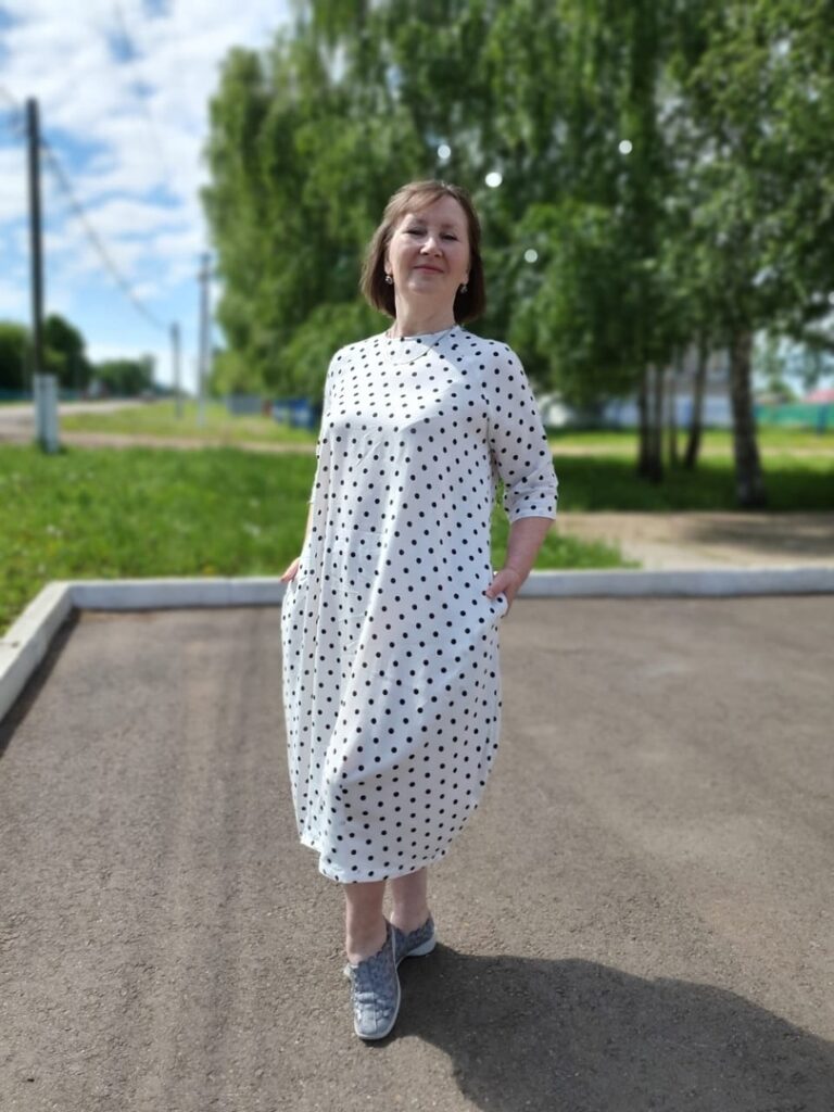 Лекала даны на размеры 80-116 по груди роста 170. Прибавка на свободу по груди меняется от 10 см до 14 см на размерах 80-116. Покрой рукавов реглан, платье заужено по низу за счет вытачек. В боковых швах выполнены карманы. На фото мое платье сшито из штапеля. На лекалах написаны размер по груди и рост. Полнота средняя, вторая.