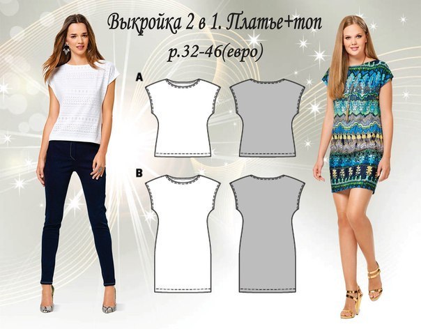 Выкройка 2 в 1. Трикотажные топ и платье р.32-46(EU)