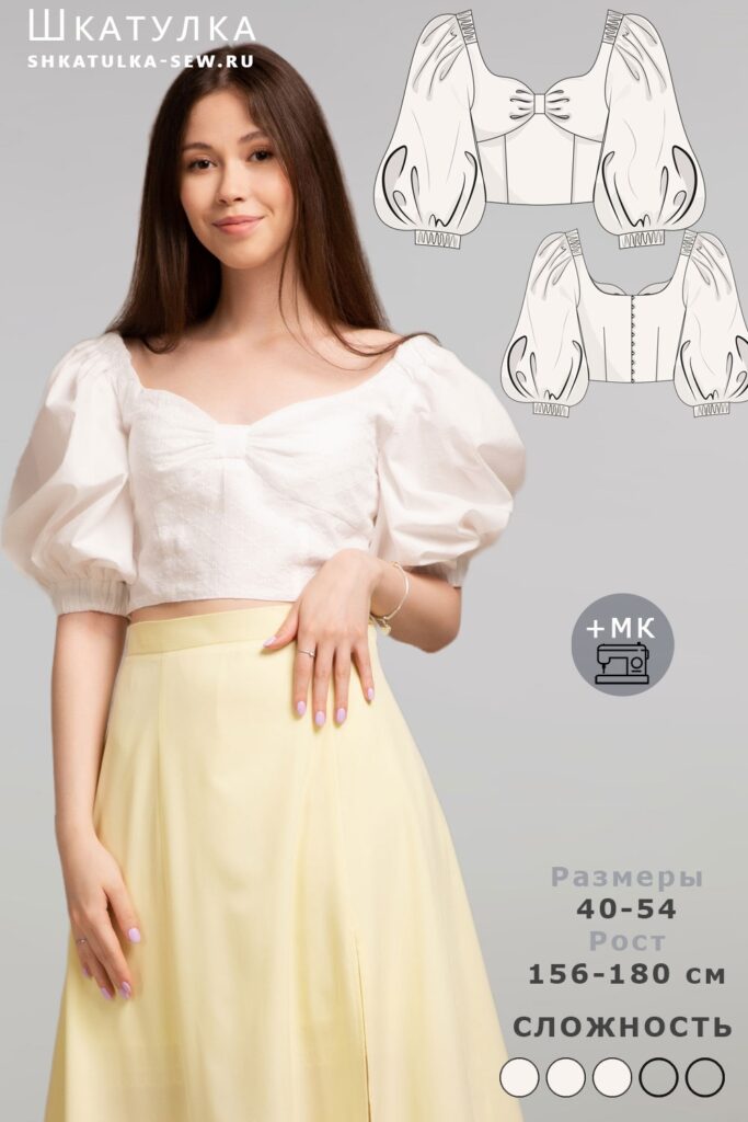 Выкройка укороченного прилегающего топа pdf с объемными рукавами. Лиф оформлен чашками со сборкой и перемычкой. В области плеч вставлена эластичная тесьма (резинка) средней ширины. Перед и спинка на подкладке из батиста.